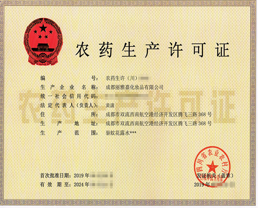 并于2019年年初獲得了最新的農(nóng)藥登記證和生產(chǎn)許可證,擁有含4.5%驅(qū)蚊酯的農(nóng)藥生產(chǎn)許可證,可生產(chǎn)驅(qū)蚊花露水等驅(qū)蚊類產(chǎn)品。