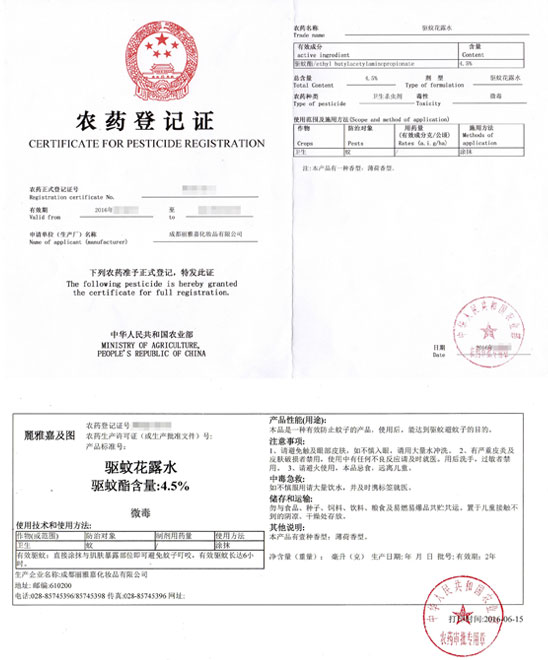 我們擁有4.5%驅(qū)蚊酯農(nóng)藥登記證和生產(chǎn)許可證